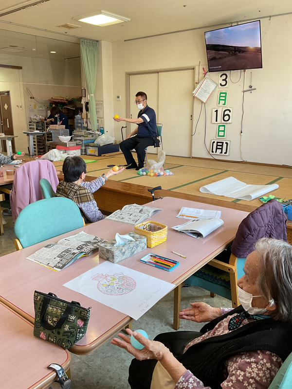 今月の体操はボールを使い、体を動かしました。ボールを落とさないように手を挙げたり、体を捻ったり。時にはボールで足を撫でマッサージをしたり。舞台に座ったお手本の職員を見ながら、皆さんしっかりと体を動かされていました。