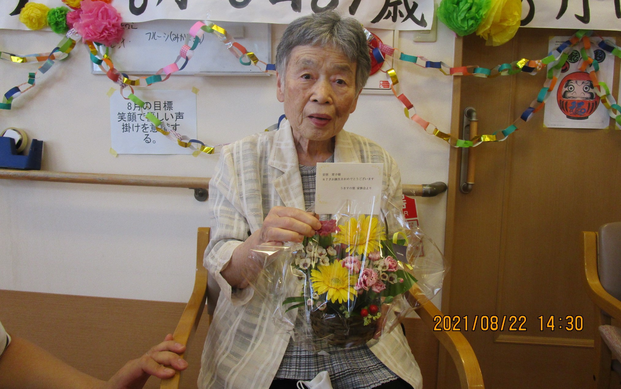 最初は職員の手作り色紙やお花をプレゼント!その後にお誕生日の